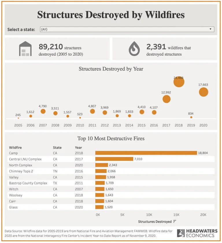 The traditional way — and the easiest way — to compare wildfire seasons is the number of acres burned. But blackened acres does not tell the whole story about the effects of fires on humans. A new, user-friendly database by Headwaters Economics identifies the number of structures, by state, destroyed by wildfires between 2005 and 2020. This is a powerful tool for communicating the importance of preparing our home ignition zones for wildfire.