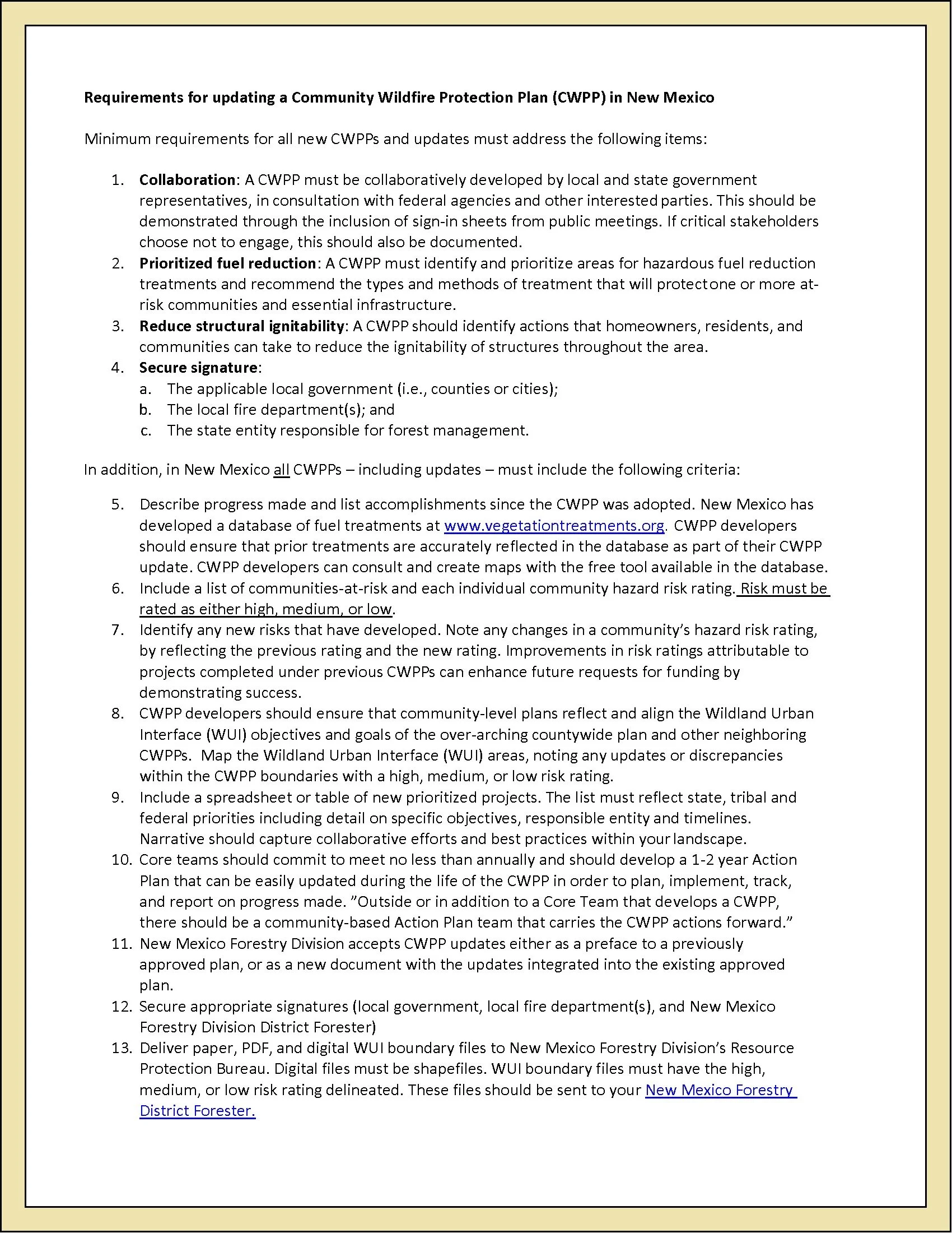 The HFRA requires local governments, local fire department(s) and the state entity responsible for forest management (EMNRD) to sign off on the final contents of a CWPP. Additional signatories on your CWPP may include collaborators involved in the creation of the plan and key individuals from communities which will be impacted.