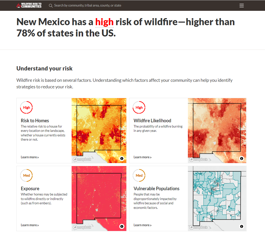 "Wildfire Risk to Communities" is a user-friendly website developed by the USDA Forest Service to aid communities in comprehending and decreasing their vulnerability to wildfires. This platform, established at the directive of Congress, offers interactive maps, charts, and resources to support informed decision-making. Utilizing the most up-to-date research insights, the website identifies and assesses wildfire vulnerability, equipping communities with the necessary tools to manage and mitigate these risks. The data used in the project is drawn from consistent sources like LANDFIRE for vegetation and fuels, the National Weather Service for weather information, and the U.S. Census Bureau for community data. Notably, wildfires and significant disturbances that happened after 2014 are not yet included in the data.