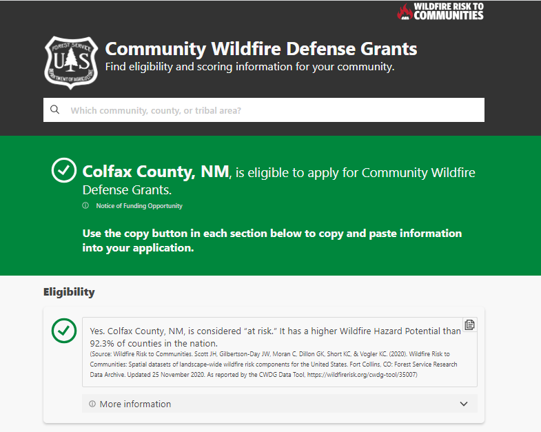 An important feature is the CWDG tool, which allows users to specify a specific region or community and generate eligibility criteria data for their CWDG application. Applicants can cut and paste the risk information directly from the Wildfire Risk to Communities site into their application, increasing their likelihood to be selected for Round 2 funding by increasing their alignment with the application terms.