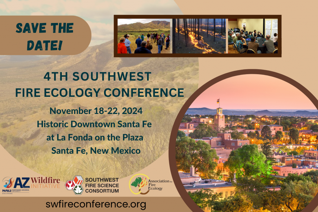 The Southwest Fire Science Consortium, Arizona Wildfire Initiative, and the Association for Fire Ecology are hosting the 4th Southwest Fire Ecology Conference in Santa Fe, New Mexico from November 18-22, 2024. With the conference theme, The Southwest Fire Science Journey: Lessons from the Rearview, New and Unfamiliar Routes, and Promising Horizons, participants and organizers seek to gain a better understanding of the past, present, and future of fire in the Southwest, including the roll of burned landscapes and lessons that can be learned from the post-fire environment and applied to future recovery and protection work. This conference will bring together professionals to share knowledge, exchange ideas, and discuss the latest advancements in fire ecology research and management with a focus on the southwestern United States. Register now for a unique opportunity to connect with fellow professionals and engage in stimulating discussions that will shape the future of fire ecology in this region.
