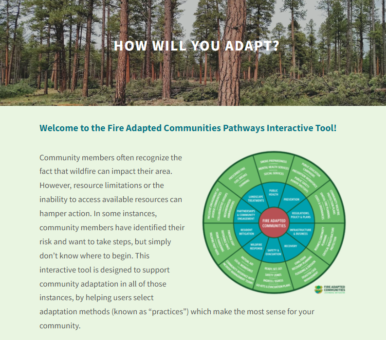 The Fire Adapted Communities Pathways Tool (Pathways Tool) helps users identify a range of fire adaptation practices and resources that research and experience indicate are more likely to work in the places they live and work.