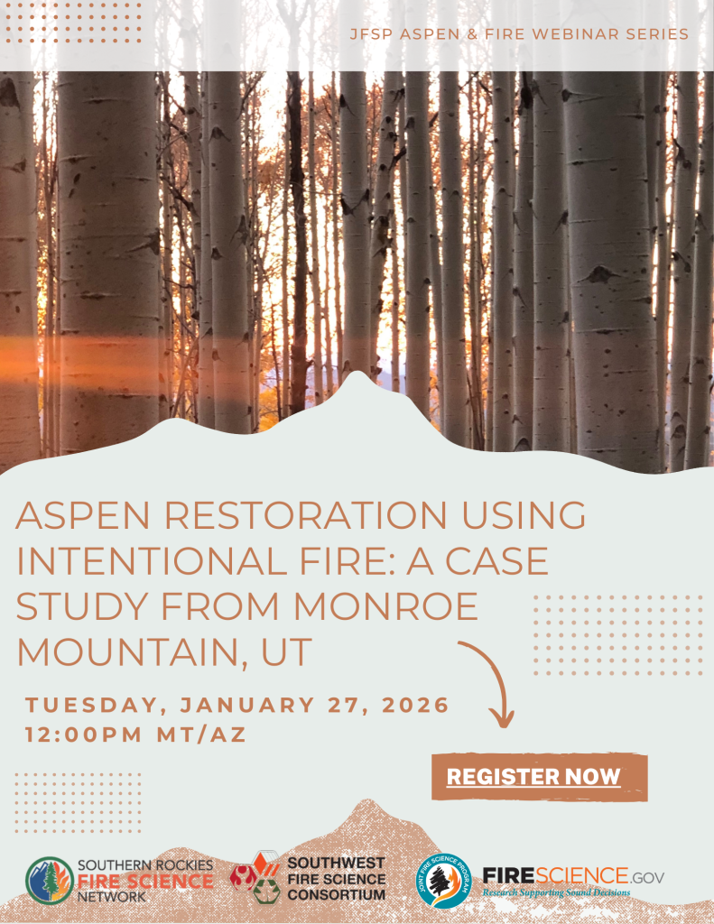This webinar from the Southwest Fire Science Consortium and Southern Rockies Fire Science Network will offer information on an aspen restoration case study from south-central Utah which used high-intensity, high-severity prescribed fire coupled with conifer thinning to improve aspen ecosystem health.