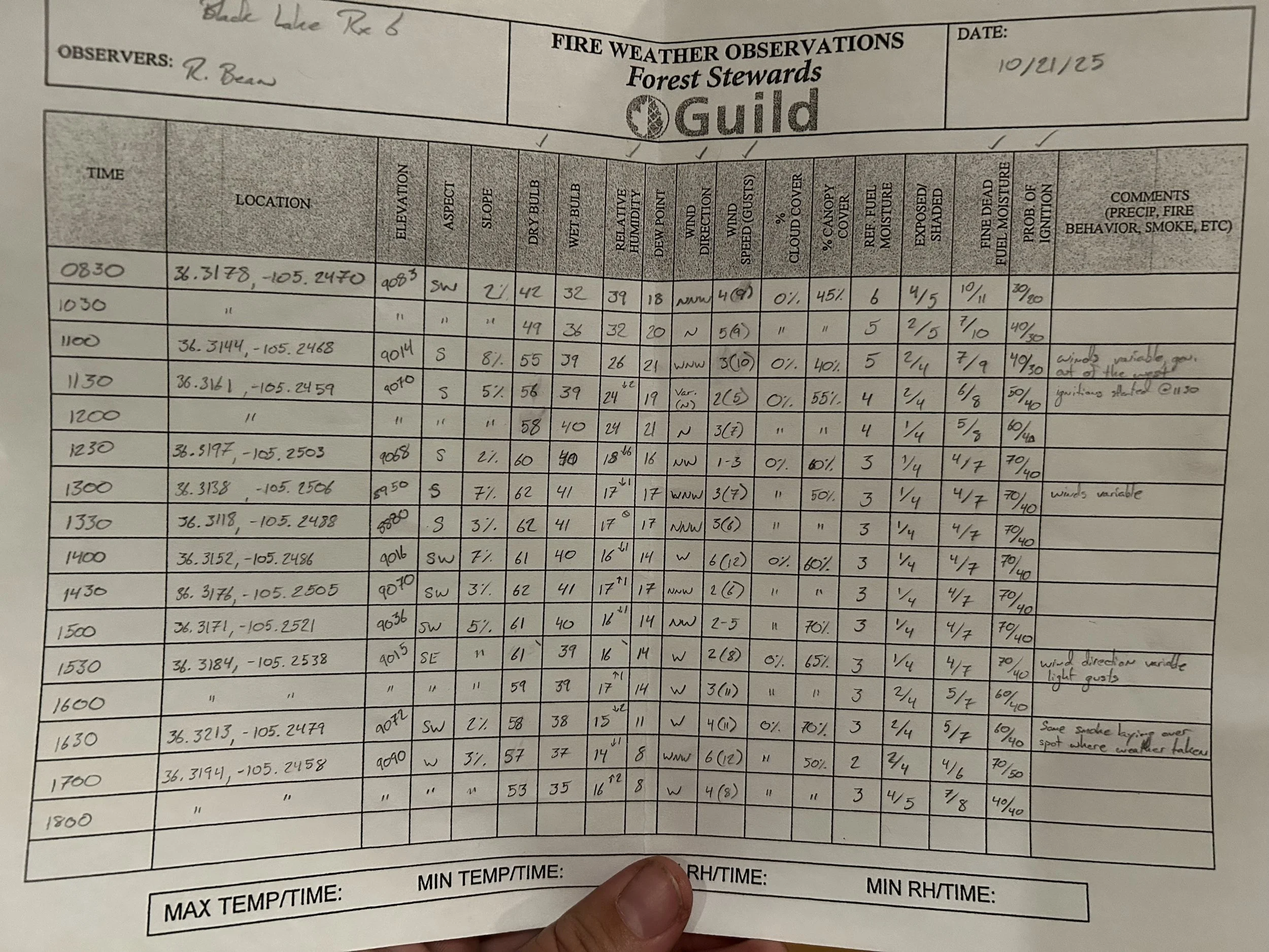 During a burn, a FEMO’s observations may be used to improve the SPOT weather forecast (a location-specific hourly weather forecast from NOAA) or help the burn boss (individual overseeing a prescribed burn) understand whether they are meeting their burn objectives. This can help the whole team adjust their actions and be immediately reactive to improve outcomes in the short-term (while a fire is ongoing).