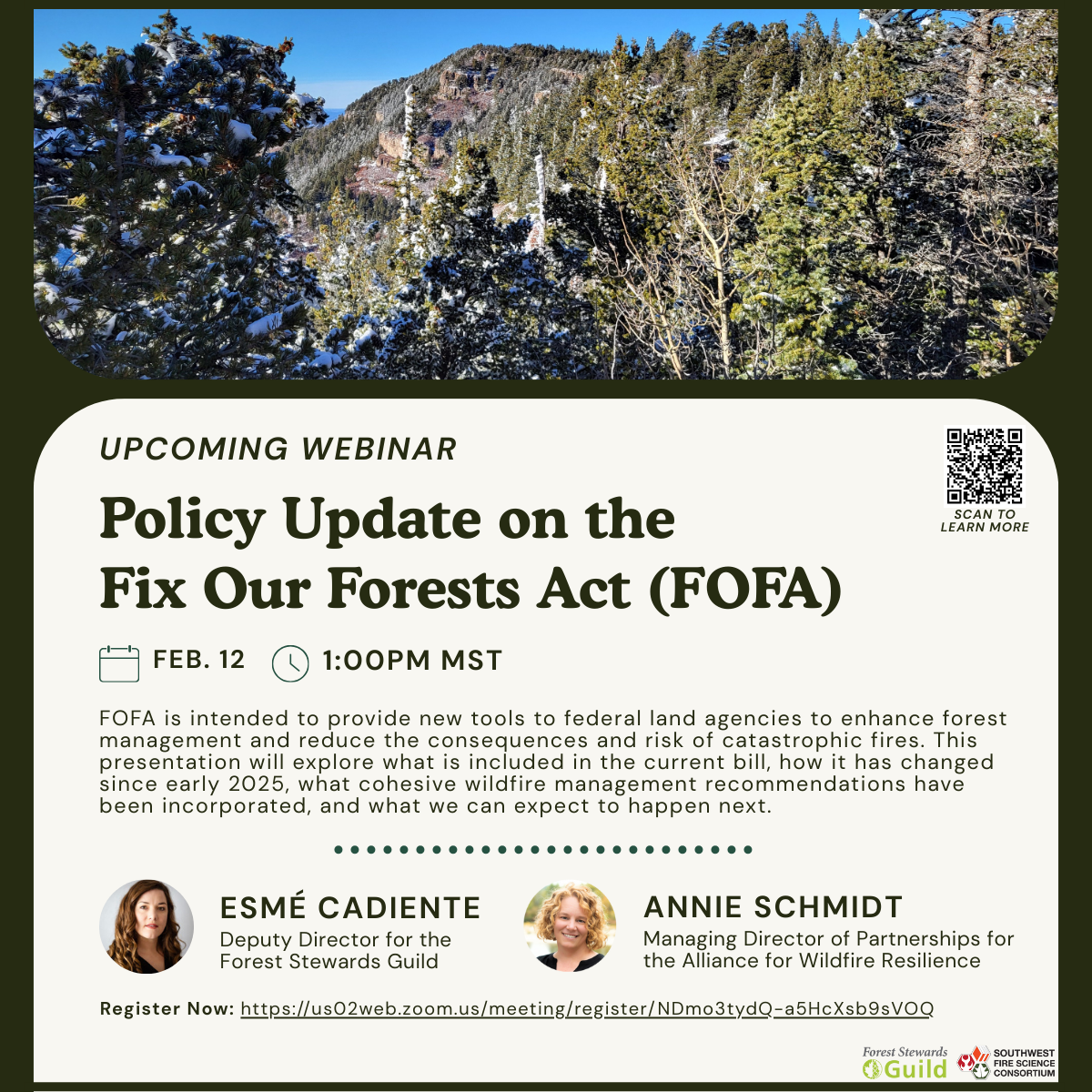 This policy update presentation from the Forest Stewards Guild and Southwest Fire Science Consortium will provide insights into the Fix Our Forests Act, including the uptake of wildfire management recommendations to congress and the potential impacts on federal land management agencies and the forests they oversee.