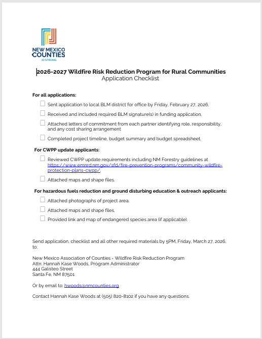 New Mexico Counties is pleased to announce the 2026-2027 Wildfire Risk Reduction Program. The grant program assists communities throughout New Mexico in reducing their risk from wildland fire on non-federal lands. Funding for this program is provided by the National Fire Plan through the Department of the Interior/Bureau of Land Management for communities in the wildland-urban interface and is intended to directly benefit communities that may be impacted by wildland fire initiating from or spreading to BLM public land.