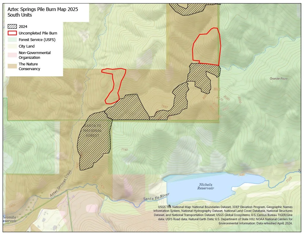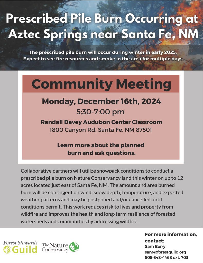 Collaborative partners will utilize snowpack conditions to conduct a prescribed pile burn on Nature Conservancy land this winter on up to 12 acres located just east of Santa Fe, NM. The amount and area burned burn will be contingent on wind, snow depth, temperature, and expected weather patterns and may be postponed and/or cancelled until conditions permit.
