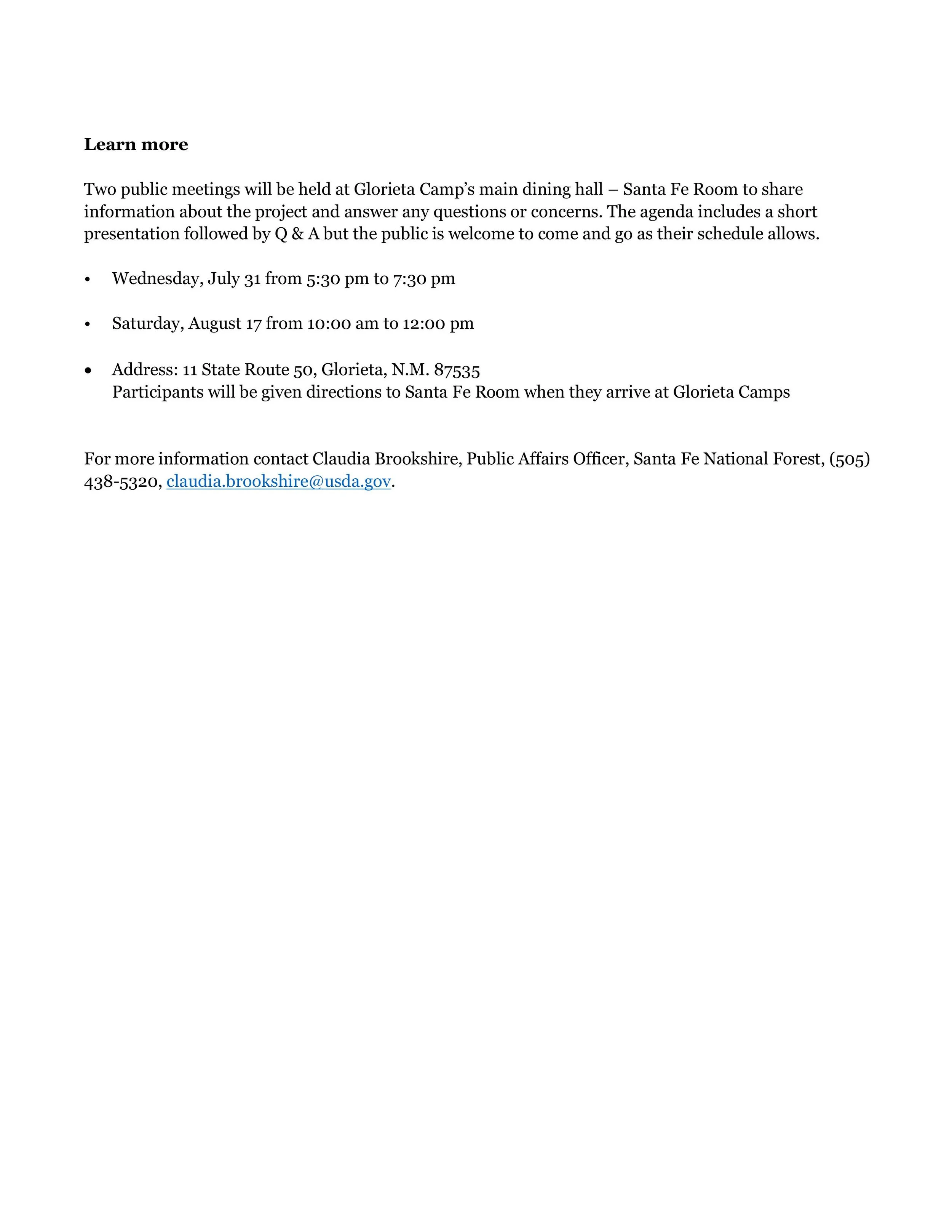 There are three project units totaling 130 acres planned for prescribed burning between September and November, depending on multiple factors including weather, fuel moisture, air quality, ventilation, and resource availability. Smoke will be visible from Santa Fe, N.M., looking north on Interstate 25, and from local communities including Pecos, La Cueva, and Glorieta.