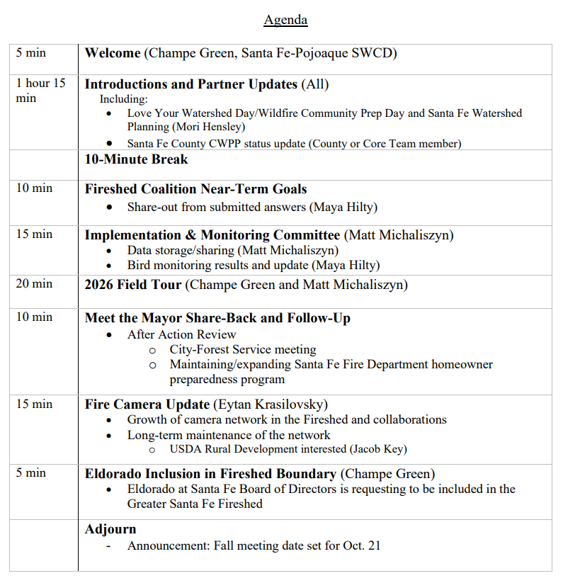 The spring Greater Santa Fe Fireshed Coalition meeting will be from 10 AM - 12:30 PM Wednesday, April 22.